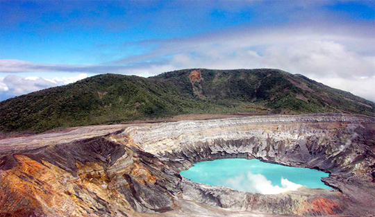 Vista del crater del Volcán Poás en una mañana de suerte con el clima que nos permitió admirar la imponencia y belleza de la naturaleza en Costa Rica.